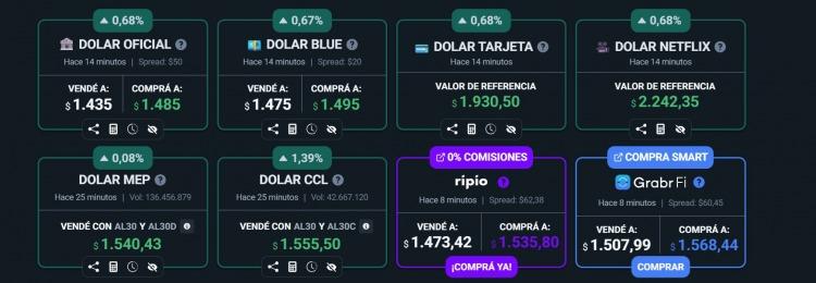 En las pizarras minoristas, el oficial se movió en $1.435 para la venta y $1.485 para la compra, el blue operó en $1.475/$1.495, el “tarjeta” se ubicó en $1.930,50 y el “Netflix” en $2.242,35. Entre los financieros, el MEP se negoció en torno a $1.540,43 y el contado con liqui en $1.555,50, con pantallas privadas mostrando spreads en torno a $60. En todos los segmentos prevaleció el verde al alza, síntoma de un mercado en modo electoral.