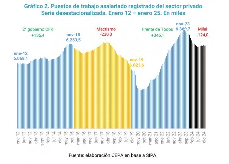 Según datos del CEPA elaborados a partir del SIPA, es decir números oficiales, el saldo del segundo gobierno de Cristina Fernández de Kirchner arroja como saldo 185,4 mil puestos de trabajo asalariados registrados creados. Luego, con la estadía de Macri en el Poder Ejecutivo y Sturzenegger a su lado, Argentina perdió 230 mil empleos de ese tipo. En cambio, con el peronismo en la gestión a través del Frente de Todos, pese a la pandemia, se construyeron 346,1 mil puestos privados en blanco a noviembre de 2023.