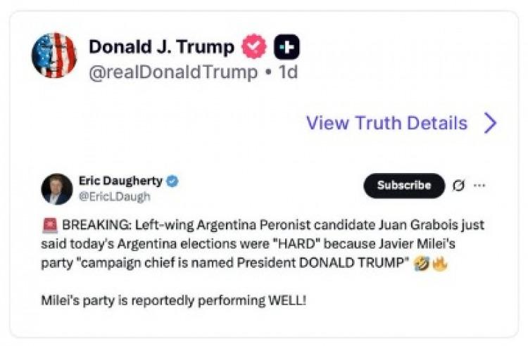El presidente estadounidense se limitó a repostear un mensaje de Eric Daugherty, subdirector de noticias del medio estadounidense llamado Florida’s Voice, en el que dan cuenta de la lectura de Grabois. "El candidato peronista de izquierda argentino, Juan Grabois, acaba de afirmar que las elecciones argentinas de hoy fueron ‘duras’ porque el jefe de campaña del partido de Javier Milei es el presidente Donald Trump", escribió Daugherty.