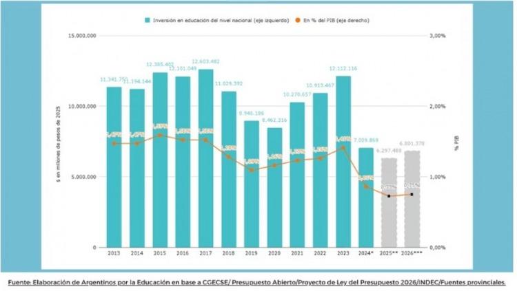 El proyecto de Presupuesto 2026 que el Gobierno nacional envió al Congreso prevé un incremento real en los recursos destinados a la educación, pero su participación dentro del Producto Bruto Interno (PBI) seguirá en los niveles más bajos de las últimas décadas. Según el informe del Observatorio de Argentinos por la Educación, el gasto educativo se ubicará en torno al 0,73% del PBI, por debajo del 0,82% estimado para 2025 y muy lejos del 1,59% alcanzado en 2015.