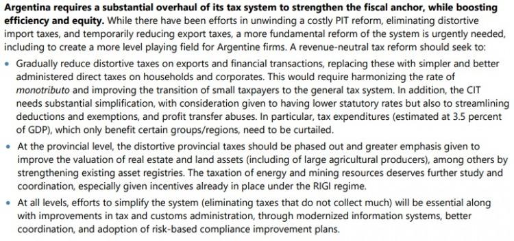 El Fondo también reclamó una reforma tributaria más amplia. En su informe, señaló la necesidad de “reducir gradualmente los impuestos que distorsionan las exportaciones y las transacciones financieras, reemplazándolos con impuestos directos más simples y mejor administrados”. En paralelo, pidió simplificar el impuesto a las ganancias y recortar “el gasto tributario (estimado en un 3,5% del PBI”.