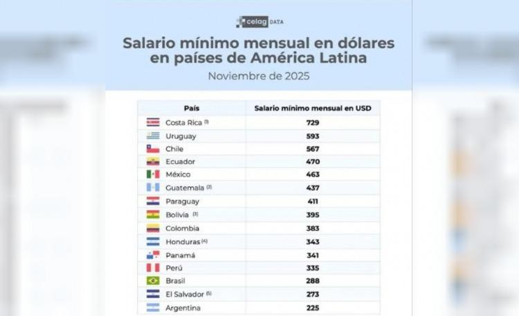 De acuerdo con un informe del Centro Estratégico Latinoamericano de Geopolítica (Celag), actualizado a noviembre de 2025, el salario mínimo argentino se ubica en el “furgón de cola” regional. Con apenas 225 dólares mensuales, Argentina queda por detrás de Bolivia (395 dólares) y Paraguay (411 dólares), mientras que Costa Rica encabeza el ranking con 729 dólares, seguida por Uruguay (593) y Chile (567).
