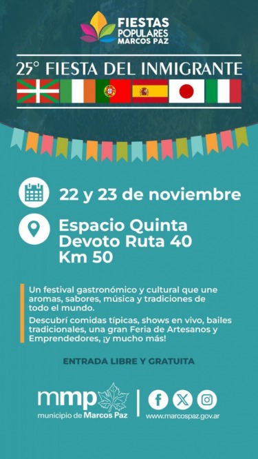 El municipio de Marcos Paz realizará este fin de semana la 25° edición de la Fiesta del Inmigrante en el predio Espacio Quinta Devoto, ubicado en Ruta 40 km 50, con entrada libre y gratuita.