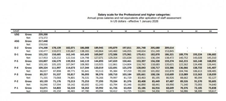 la última escala salarial de Naciones Unidas vigente desde enero de 2026 fija para cargos jerárquicos ingresos anuales netos de entre USD 120.000 y USD 150.000, lo que equivale a entre USD 10.000 y 12.500 mensuales. Convertidos al tipo de cambio oficial, esos montos se traducen en ingresos cercanos a los $15 millones por mes, cifra que se incrementaría con adicionales por costo de vida enumerados previamente.