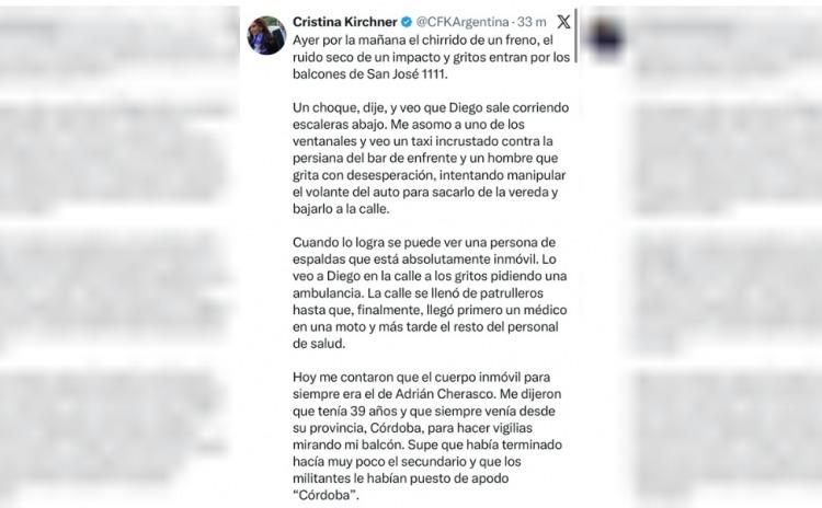 “Ayer por la mañana el chirrido de un freno, el ruido seco de un impacto y gritos entran por los balcones de San José 1111. Un choque, dije”, relató la ex presidenta, quien describió cómo observó desde su departamento el momento posterior al impacto. En ese marco, contó que vio a su hijo bajar a la calle para pedir una ambulancia, mientras un taxi permanecía incrustado contra la persiana de un bar y un hombre gritaba desesperado intentando mover el vehículo.