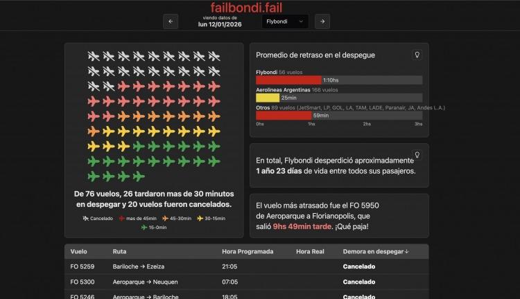 En medio del caos aéreo que se profundizó durante el verano, comenzó a ganar notoriedad la página Failbondi, un sitio que muestra en tiempo real los vuelos cancelados y demorados de Flybondi. La plataforma se convirtió en una referencia para pasajeros afectados y para el propio sector aerocomercial, al visibilizar con números concretos el deterioro del servicio.