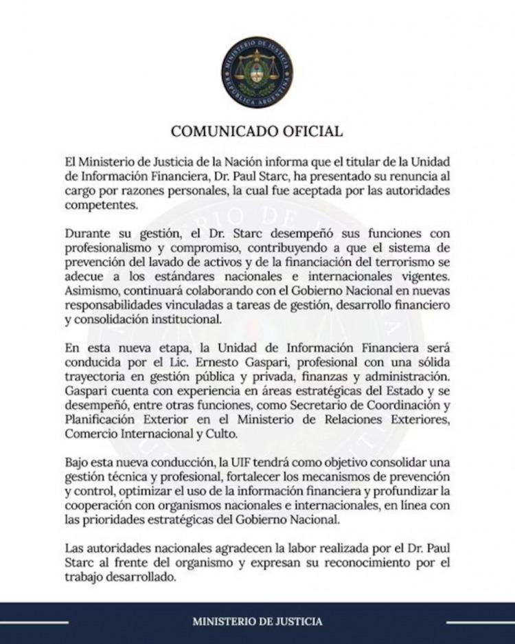 “Durante su gestión, el Dr. Starc desempeñó sus funciones con profesionalismo y compromiso, contribuyendo a que el sistema de prevención del lavado de activos y de la financiación del terrorismo se adecue a los estándares nacionales e internacionales vigentes", señalaron en el escrito difundido por el Ministerio de Justicia.