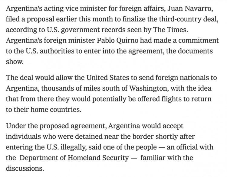 El entendimiento habilitaría a Estados Unidos a enviar a Argentina ciudadanos extranjeros detenidos tras ingresar de manera ilegal a su territorio, con la idea de que desde Buenos Aires se les ofrezcan vuelos para regresar a sus países de origen. La información fue confirmada por un funcionario del Departamento de Seguridad Nacional norteamericano involucrado en las conversaciones.