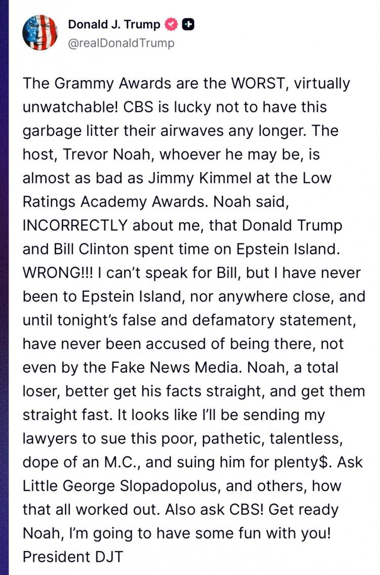 El presidente también cuestionó a la ceremonia y a la cadena que la transmitió. “¡Los Premios Grammy son lo peor, prácticamente imposibles de ver! CBS tiene suerte de que esta basura ya no ensucie sus ondas”, escribió, y cerró con una advertencia directa al conductor: “Prepárate, Noah, me voy a divertir contigo”.