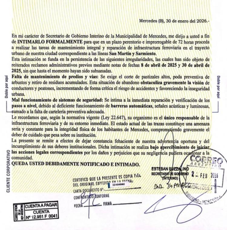El documento también reclamó la revisión inmediata de los cruces ferroviarios por el “deficiente funcionamiento de barreras automáticas, señales acústicas y luminosas, sumado a la falta de cartelería preventiva adecuada”, y dejó asentado que la intimación se realizó “bajo apercibimiento de iniciar las acciones legales correspondientes por los daños y perjuicios”.