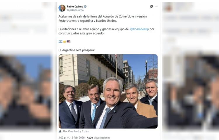 La rúbrica del entendimiento fue confirmada por el canciller Pablo Quirno, tras un encuentro con autoridades de la Oficina del Representante Comercial de los Estados Unidos. A través de sus redes sociales, el funcionario celebró el acuerdo y agradeció al equipo norteamericano por “construir juntos este gran acuerdo”.