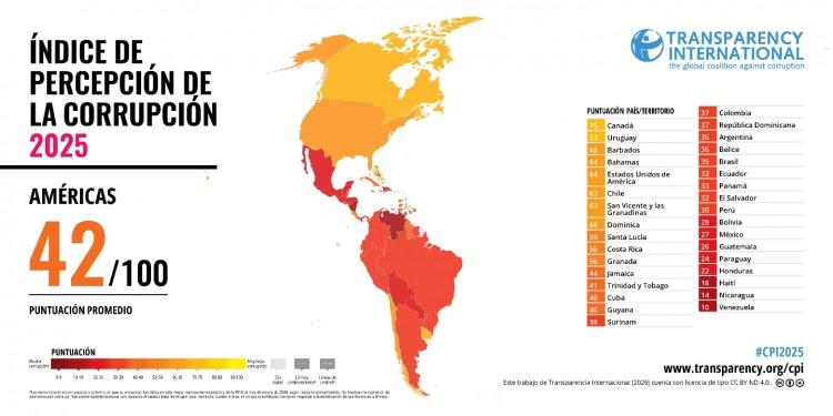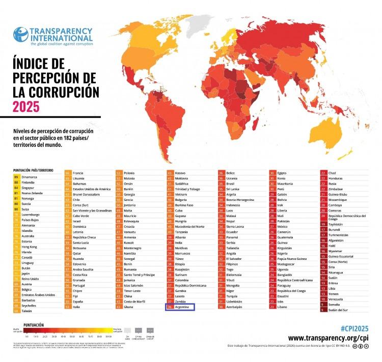 En el segundo año de gestión del presidente Javier Milei, Argentina volvió a retroceder en el Índice de Percepción de la Corrupción 2025, esta vez, cinco posiciones dentro el ranking global que elabora anualmente la ONG Transparencia Internacional, con un puntaje de 36 sobre 100 que la ubica por debajo del promedio del continente americano y expone un deterioro respecto de la medición previa.