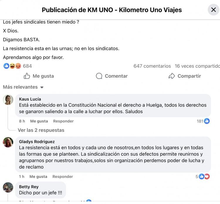 En las últimas horas, la cuenta verificada de KM Uno – Kilómetro Uno Viajes publicó un mensaje en el que se preguntaba: “Paro el Jueves ?”, “No hay otro método?” y remataba con un tajante “Digamos BASTA. La resistencia esta en las urnas; no en los sindicatos”. La firma pertenece a Luis Paretti, empresario que quedó mencionado en el entramado que investiga la Justicia en el llamado “caso Chocolate”.