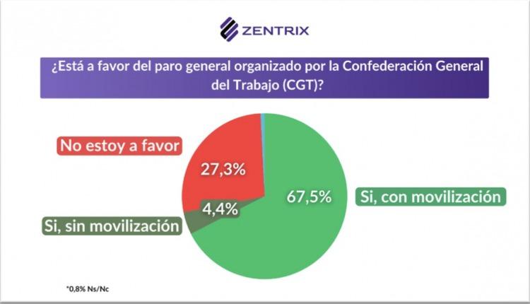 La encuesta preguntó de manera directa: “¿Está a favor del paro general organizado por la Confederación General del Trabajo (CGT)?”. El 67,5% respondió que está a favor con movilización y un 4,4% apoyó la medida sin movilización. En total, el 71,9% se manifestó favorable al paro. En contraposición, el 27,3% declaró no estar de acuerdo y apenas el 0,8% no supo o no contestó. El respaldo mayoritario se expresó incluso cuando la propia central obrera anticipó que no promoverá una movilización masiva.