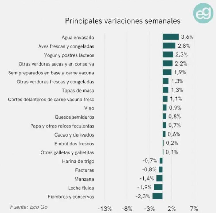 Las bebidas e infusiones también se ubicaron entre los principales motores, con un incremento semanal de 1%, destacándose el ajuste del agua envasada, que escaló 3,6%. En contraste, algunos segmentos como fiambres y frutas mostraron retrocesos puntuales, aunque no alcanzaron para compensar la presión de los productos básicos.
