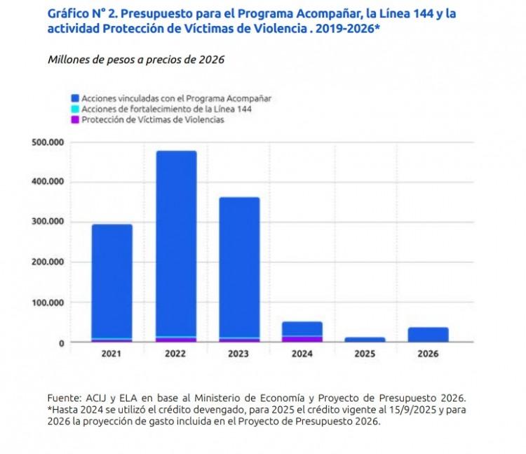 Según organizaciones especializadas, el efecto combinado de estos recortes se reflejó en el financiamiento total de las políticas. Un relevamiento conjunto de ACIJ y el Equipo Latinoamericano de Justicia y Género (ELA) calculó que, al sumar la caída en el Programa Acompañar, la Línea 144 y otras iniciativas de asistencia,