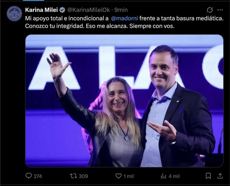 La secretaria general de la Presidencia utilizó su cuenta en redes sociales para manifestar un respaldo directo al funcionario. “Mi apoyo total e incondicional a @madorni frente a tanta basura mediática. Conozco tu integridad. Eso me alcanza. Siempre con vos”, escribió, en un mensaje que rápidamente se viralizó y alimentó el debate público.