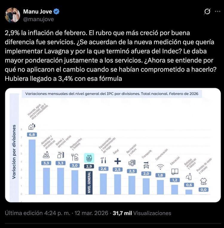 El planteo retomó una discusión que atravesó los últimos meses de la gestión anterior y que incluyó la salida de Marco Lavagna del organismo estadístico. Según esa propuesta, los servicios debían tener mayor incidencia en la medición para reflejar con mayor precisión el impacto del costo de vida en los hogares.