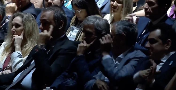 El clima se tensó aún más cuando Milei decidió elogiar públicamente a su asesor durante el discurso. “Hay una frase que se la debo a Santi Caputo”, afirmó el mandatario, lo que provocó aplausos en el auditorio. La transmisión oficial mostró a Karina Milei observando la situación con gesto adusto, mientras otros funcionarios acompañaban la ovación.