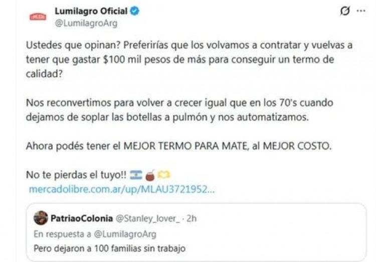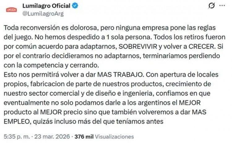 Lo que nadie esperaba era el giro estocolmista de la dirección de la empresa. En un posteo en la red social X (ex Twitter), la cuenta oficial de Lumilagro lanzó un mensaje que heló la sangre de sus propios operarios despedidos. Con una estética que imitaba la agresividad comunicacional del oficialismo, la empresa defendió la apertura de importaciones y el modelo de Milei, argumentando que la competencia los "obligaba a ser mejores".