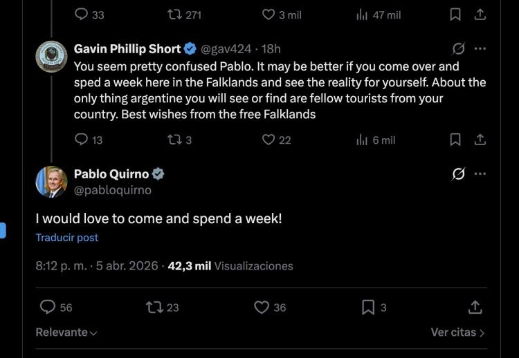 Lejos de sostener la misma firmeza, Quirno respondió en inglés al mensaje de Gavin Phillip Short con una frase breve: “I would love to come and spend a week!”. La respuesta no solo evitó mencionar a las Islas Malvinas, sino que además expresó interés en visitarlas como turista, lo que generó fuertes críticas en redes sociales.