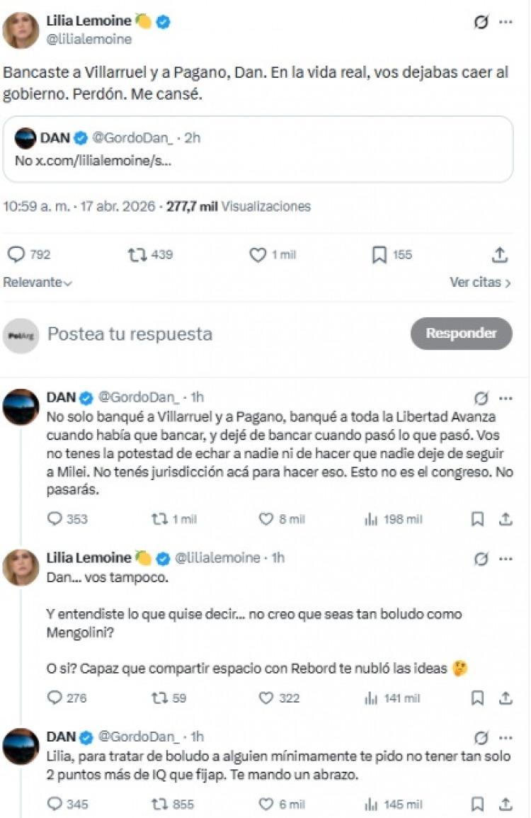 Finalmente, Lemoine cerró el intercambio con un mensaje irónico que sumó más ruido interno: “Ya está, renuncio a la banca. Ganaste, Dan. Adiós”, publicó, en medio de una nueva polémica pública dentro del oficialismo.