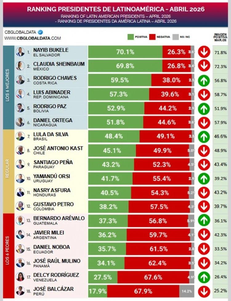 La tabla está liderada por Nayib Bukele (El Salvador), con 70,1% de imagen positiva; Claudia Sheinbaum (México), 69,8%; Rodrigo Chaves (Costa Rica), 59,5%; Luis Abinader (República Dominicana), 57,3%; Rodrigo Paz (Bolivia), 52,9%; y Daniel Ortega (Nicaragua), 51,8%.
