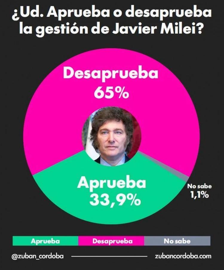 La desaprobación de la gestión liberaría mantuvo su ritmo alcista en lo que va del año: saltó de 49,6% en diciembre, a 52,3% en febrero, 58,7% en marzo y un 65% en abril. En contrapartida, la aprobación fue a la inversa: 48,8%, 45,6%, 35,4% y 33,9%, respectivamente.