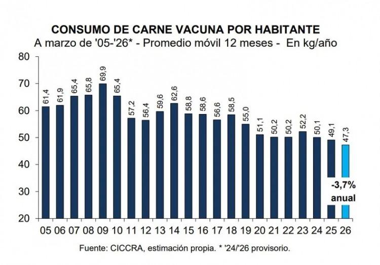 Al momento de analizar el consumo por habitante, los datos marcan que el promedio anual alcanzó los 47,3 kilos por año, el más bajo en más de 20 años, cuando los niveles de consumo superaban los 60 kilos por persona.
