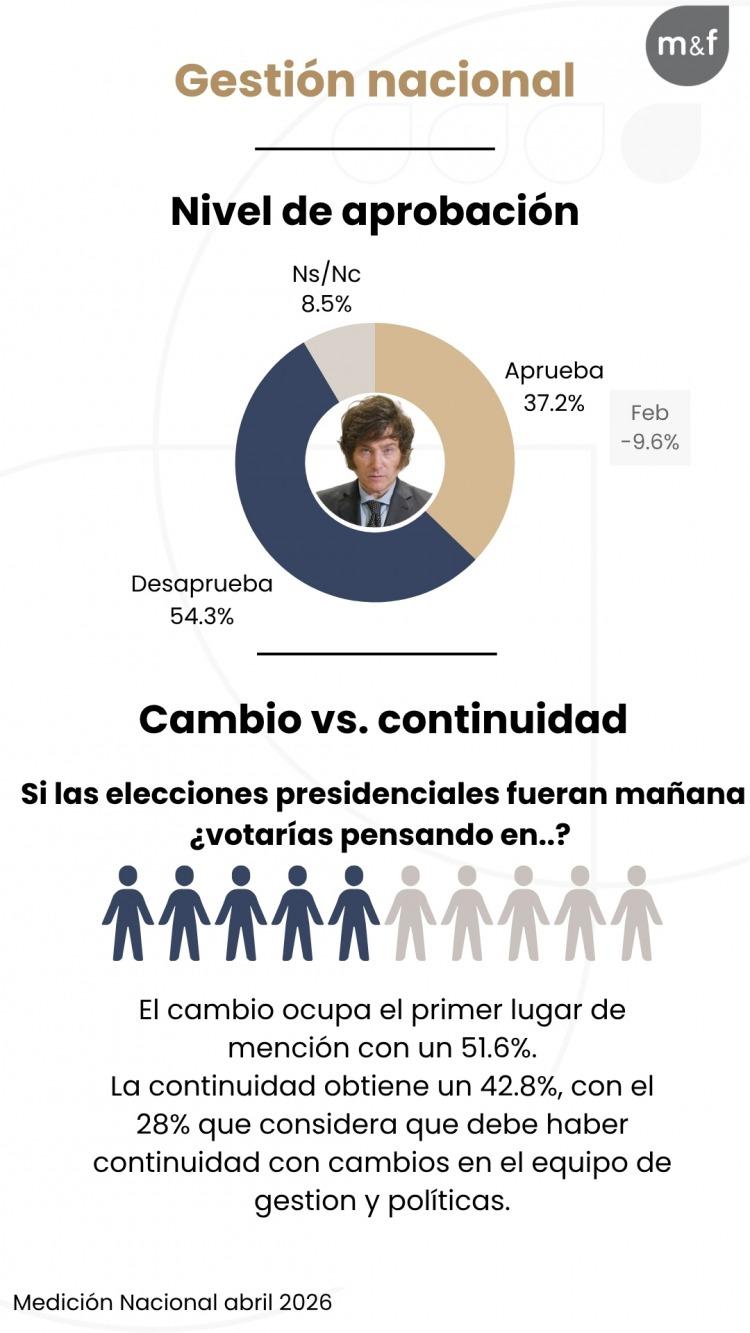 En paralelo, el relevamiento de la consultora Management & Fit muestra una caída de casi diez puntos en la aprobación del Gobierno, que pasó del 46,8% en febrero al 37,2% en abril, consolidando una tendencia negativa en la imagen oficial.