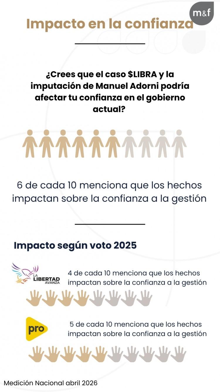 6 de cada 10 encuestados señalaron que los casos $LIBRA y la situación de Manuel Adorni afectan su confianza en el Gobierno, un efecto que se replica incluso entre votantes oficialistas, donde entre 4 y 5 de cada 10 reconocen ese deterioro.