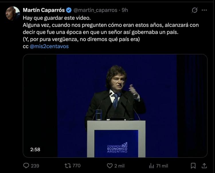 “Hay que guardar este video. Alguna vez, cuando nos pregunten cómo eran estos años, alcanzará con decir que fue una época en que un señor así gobernaba un país. (Y, por pura vergüenza, no diremos qué país era)”, expresó Caparrós, en un mensaje que rápidamente se viralizó y condensó el malestar de amplios sectores frente a los ataques oficiales a los medios.