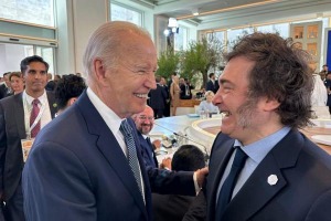 Las cámaras oficiales de la cumbre de líderes internacionales captaron el momento en el que el argentino saludó a su estadounidense. Además, se ubicó al lado del presidente norteamericano para escuchar el discurso del Papa Francisco.