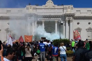 La votación resultó con 23 positivos, 9 negativos y 11 abstenciones. Pero mientras se debatía el proyecto, gremios docentes y estatales que se encontraban afuera quisieron ingresar al recinto para presenciar la votación, pero hubo represión de la policía con gases y palos.
