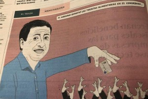 En El Cronista salió una caricatura que poco tiene de humor, allí muestran al ministro de Desarrollo Social Daniel Arroyo en figura gigante que sostiene una tarjeta mientras miles de manos se estiran por alcanzarla. La burla a la tarjeta alimentaria se da en un contexto donde millones de argentinos se encuentran en situación de pobreza o indigencia.