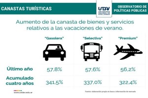 Según un estudio de la Universidad Nacional de Avellaneda la canasta básica de vacaciones rondaría los 50 mil pesos. “A los incrementos habituales por factores estacionales, se agrega la postergada restitución de márgenes de ganancias donde los empresarios intentan recuperar parte del terreno perdido en un contexto de fuerte retracción de la demanda”, se remarca en el documento.