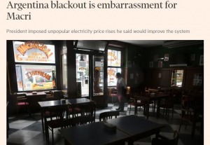 El periódico británico especializado en información económica y financiera sostuvo que el apagón “en la escala del desastre del domingo” que dejó sin servicio eléctrico a casi 50 millones de personas “no tiene precedentes”. “El corte de energía fue una seria vergüenza para el presidente Mauricio Macri, quien enfrenta una difícil campaña electoral en medio de una recesión”, remarcaron.