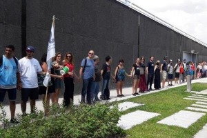 Trabajadores de Canal 7, referentes de derechos humanos, periodistas y artistas participaron de un masivo abrazo al edificio de Figueroa Alcorta y Tagle.