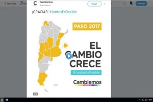 A horas de que todos los medios publicaran que la expresidenta se impuso por 20 mil votos sobre el oficialismo, la cuenta de la alianza macrista continúa con un tuit publicado en que se observa un mapa con las provincias en que resultaron ganadores pintadas de amarillo, entre las que está el territorio bonaerense.