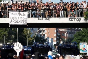 En medio de las manifestaciones contra la cumbre de los países más poderosos en Hamburgo, se pudo observar un duro mensaje contra el Presidente en una bandera. No es la primera vez que le dedican duras consignas al líder PRO durante sus giras internacionales.