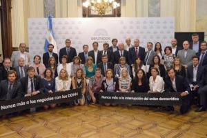 Los legisladores de Cambiemos se fotografiaron con dos carteles que llevaban el lema de "Nunca más a los negocios con los DDHH" y otro que afirmaba que "los Derechos Humanos no tienen dueño".