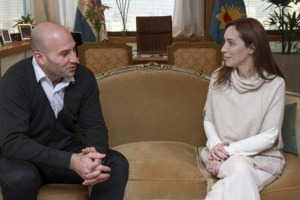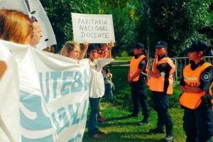 Durante la visita oficial a la fábrica de helicópteros en Cicaré, el Presidente y la Gobernadora de Buenos Aires ordenaron a efectivos de la Policía Federal y de la Gendarmería que bloquearan el paso a un grupo de maestros que intentó acercarse a los funcionarios.