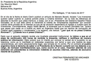 La expresidenta realizó la intimación al Presidente argentino y por otro lado al exmandatario español para que en el plazo de veinticuatro horas de recibida la carta documento, ratifiquen o rectifiquen de manera pública la información divulgada por Marcelo Bonelli en el diario Clarín.