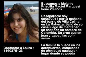 Melanie Priscila Maciel Marquesi desapareció ayer por la mañana mientras cuidaba a su hermano. Los padres temen que "sea otra víctima de trata". Estaba en contacto a través de las redes sociales con un ciudadano colombiano.
