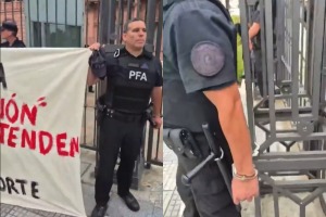 El cabo Miguel Ángel Montiel realizó una protesta individual en la reja de la sede del Gobierno para visibilizar su situación salarial y denunciar presuntas irregularidades internas. Pasado el mediodía fue retirado del lugar y trasladado a una dependencia de la fuerza.